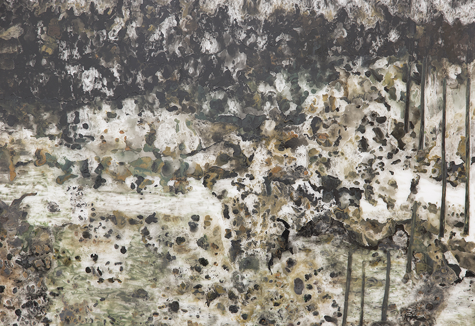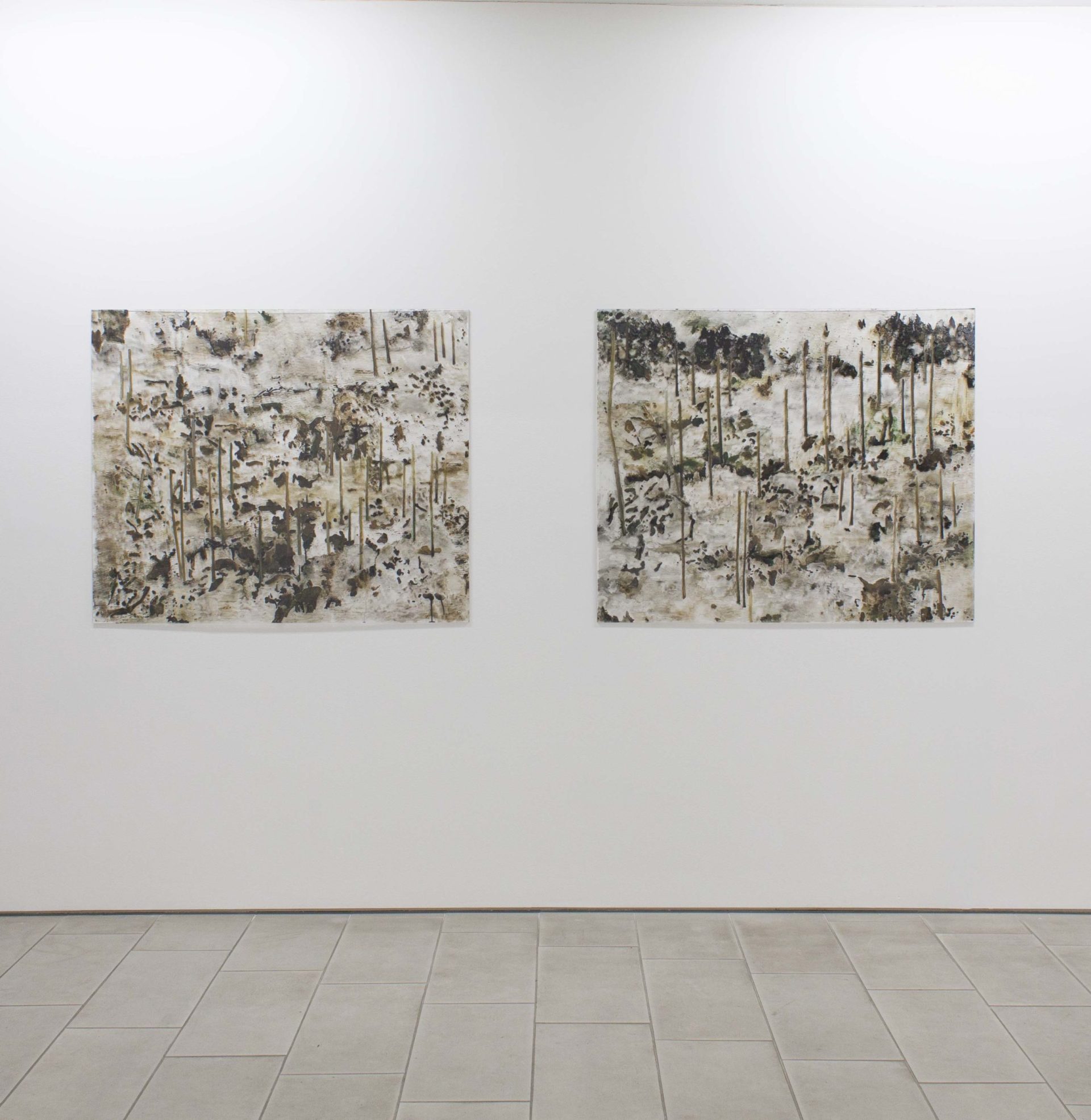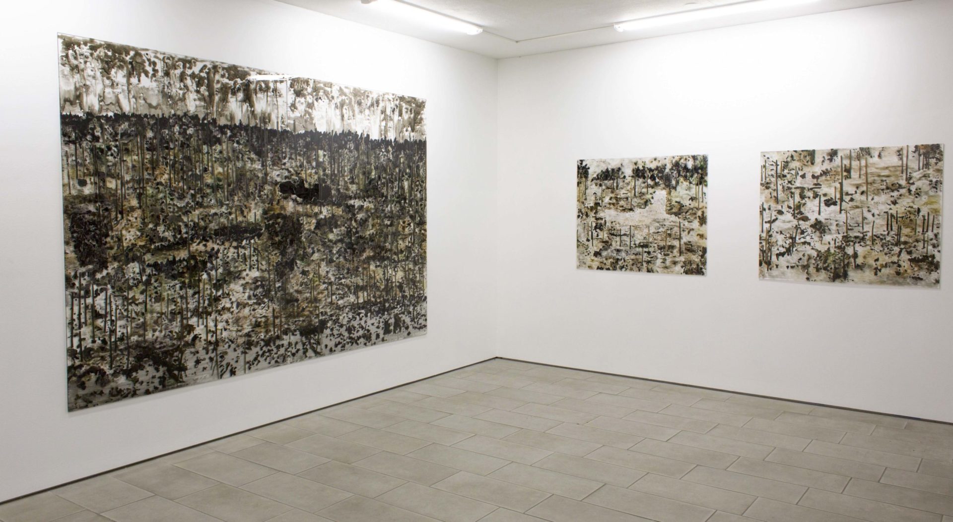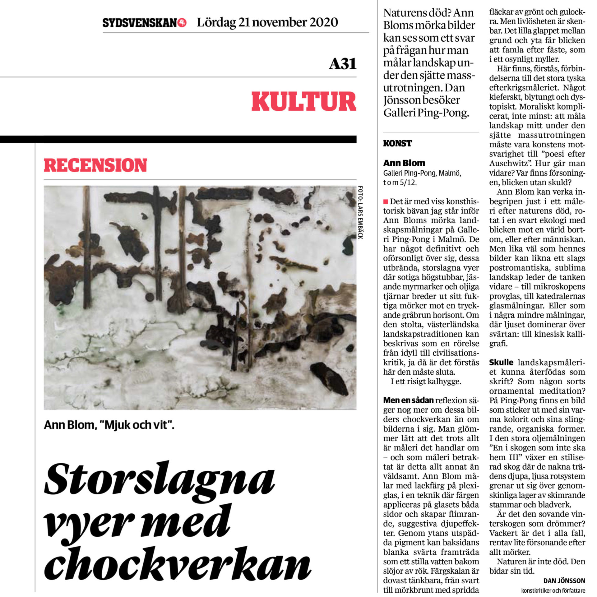 Den terräng som Ann Blom återvänder till är både främmande och välbekant. Därmed liknar den måleriet som sådant. När vi träffas i ateljén i Malmös industrihamn påminner hon om att till målandets ordning hör att vid arbetets början inte veta hur det slutar. På akrylglaset kan hon skissa upp konturer och på avigsidan måla dit vattnets bottenlösa djup och svarta spegling. Kulörerna är få. Det räcker med ett par nyanser av brunt, grönt, kanske ockra och så svart, som enkelt låter sig lösas med terpentin från blankt opakt till drypande transparens. Burkarna med lackfärg är minimala och penslarna små. Men målningarna har under senare år blivit alltmer monumentala. Förutom tid och rum glömmer hon under arbetet också sig själv. På liknande sätt frigör sig hennes vyer från varje kronologi, geografi och biografi. De är ingenmansland och allemansland. Deras glesa stammar kan vittna om kalhygge eller stormens efterspel, om människans spår eller urskog lämnad åt sitt förfall och nya begynnelser.