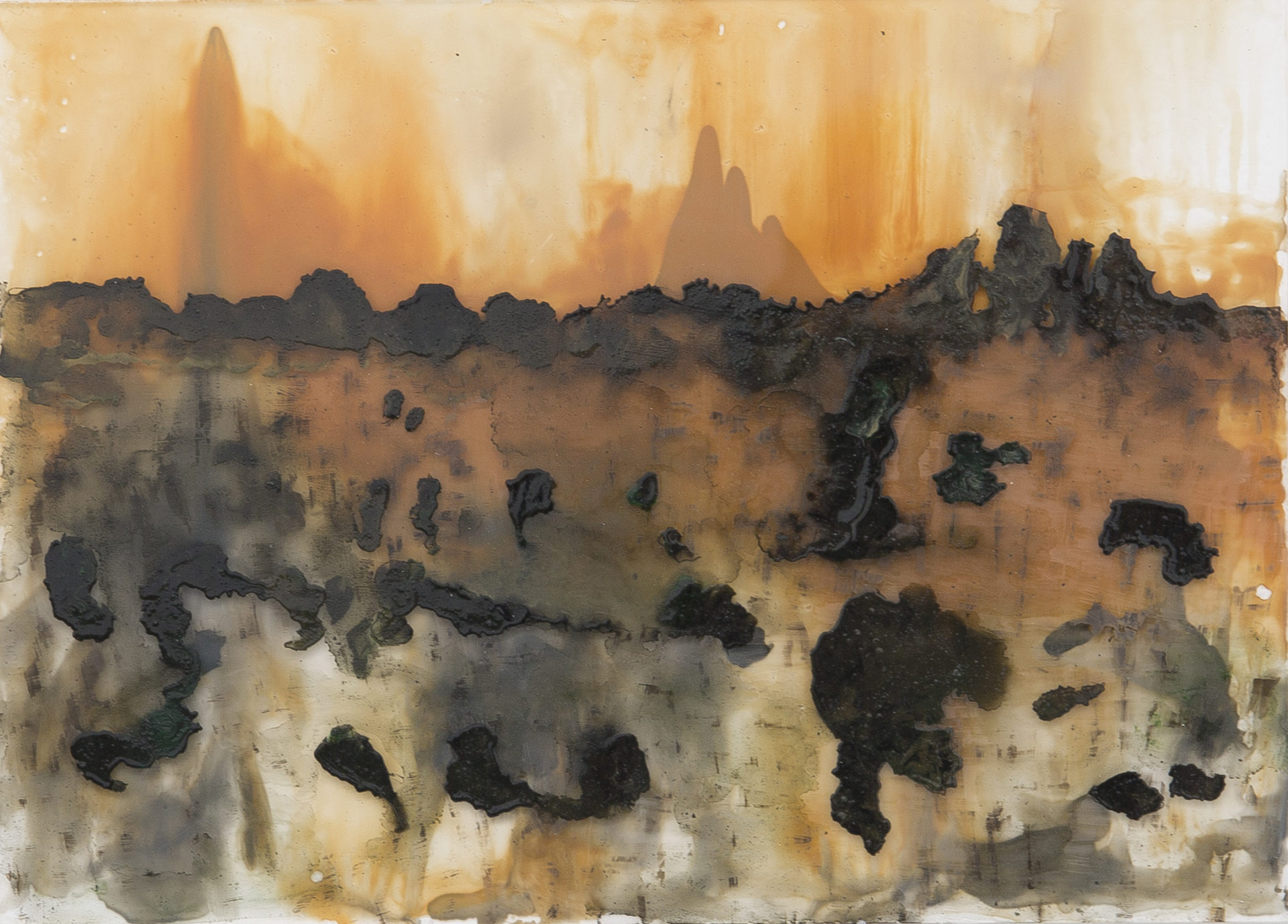 “Det är en skog som förlåter allt men ingenting glömmer” skriver poeten Tomas Tranströmer i ”Molokai”. Medan fukten rasar över ytan i sotiga ridåer av moln föreställer jag mig de skikt som lagras i Ann Bloms topografi. Här ryms vildmarken och sluttningen bakom höghusen. Det som drömts, det som varit och det som väntar. Måleriets tyngd och lätthet. Någonstans moler en existentiell dimension. I bakgrunden lurar romantiken. Fast snarare än att bejaka dess besatthet av människans litenhet inför naturens och vädrets makter – ja, skapelsens storslagenhet – löser hon upp distansen. Där finns inga svindlande höjder, perspektiv eller utsiktspunkter. Bara dessa landskap att förlora sig i.