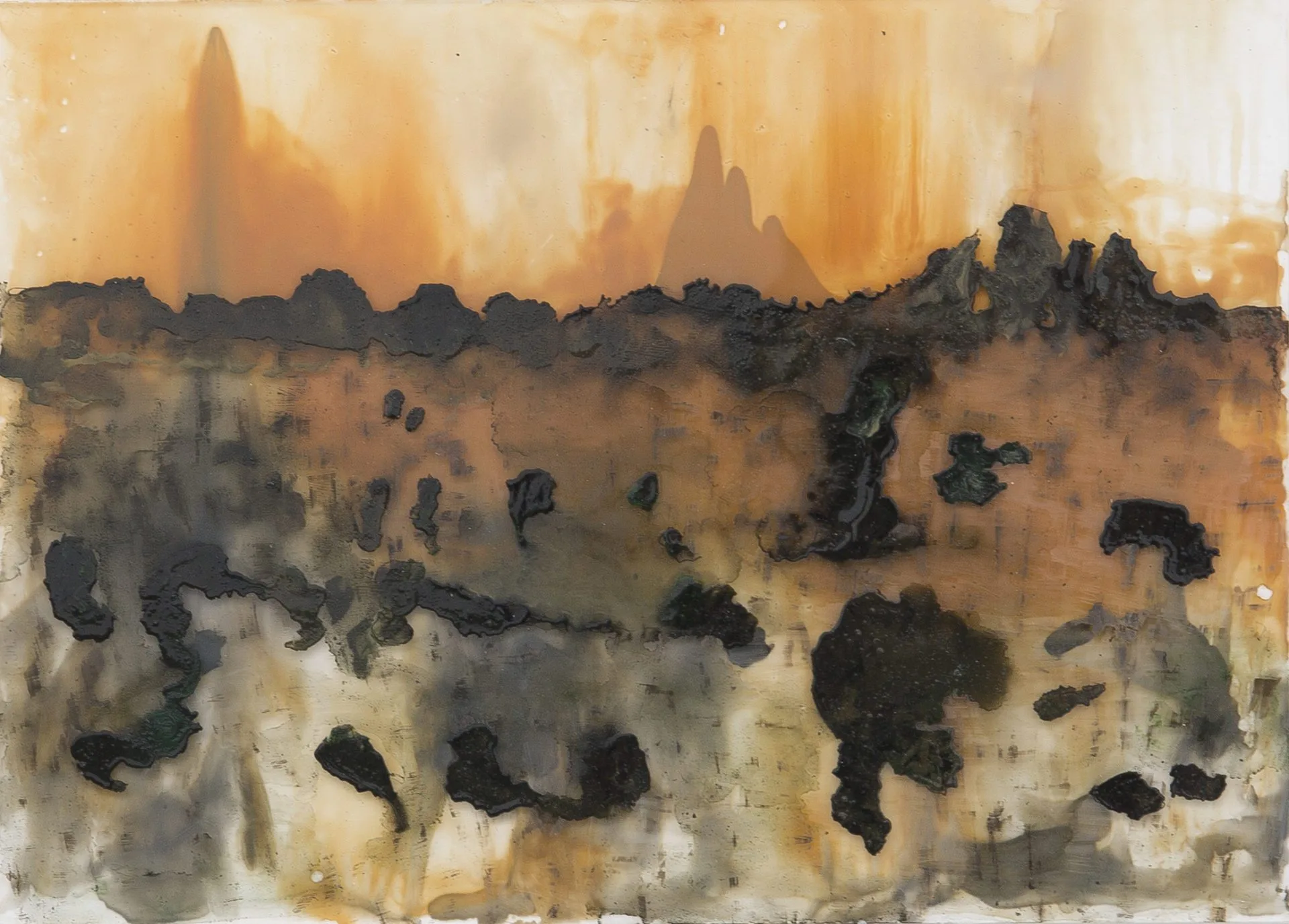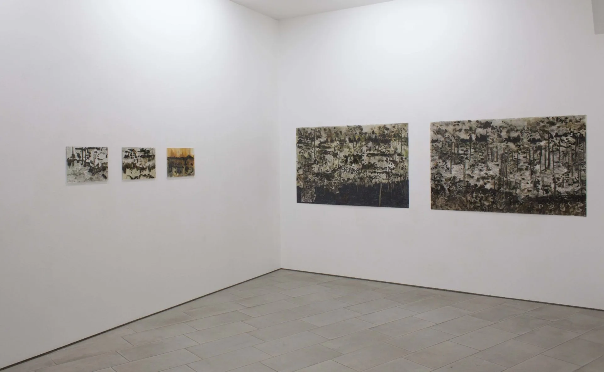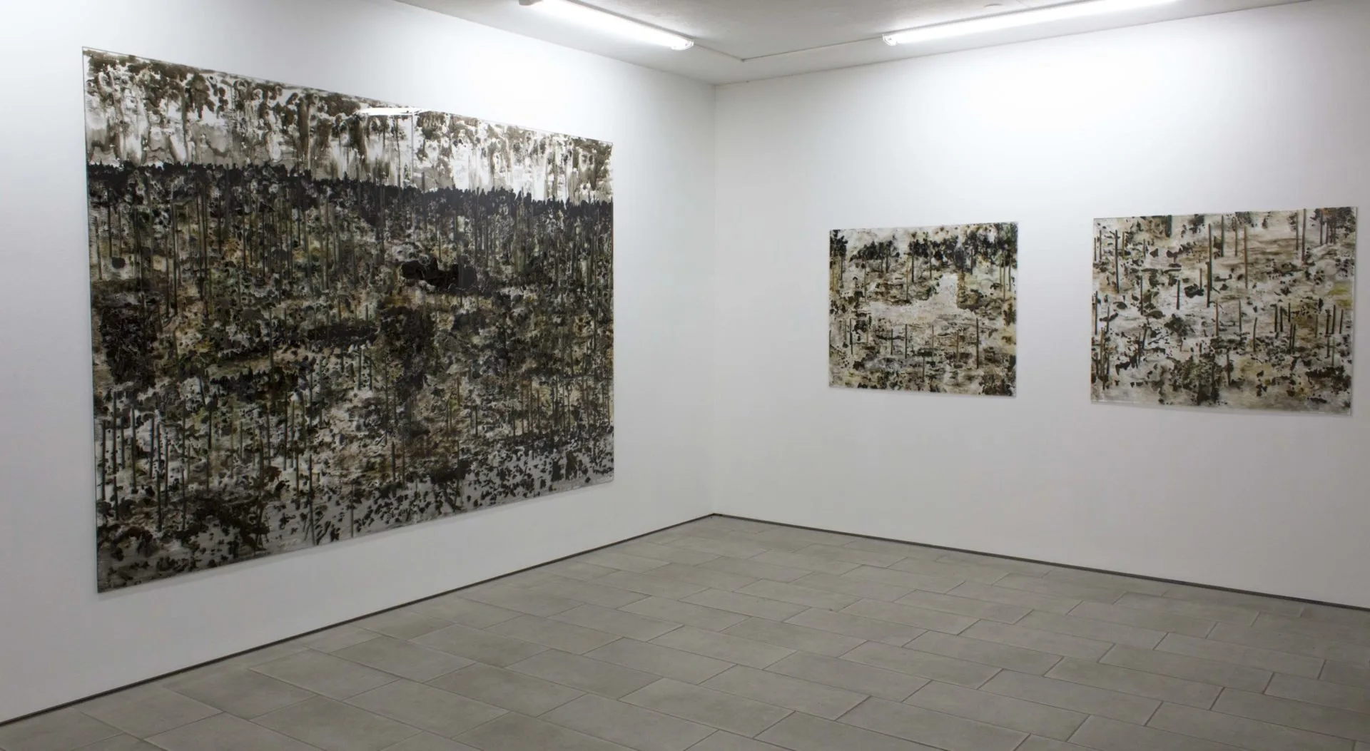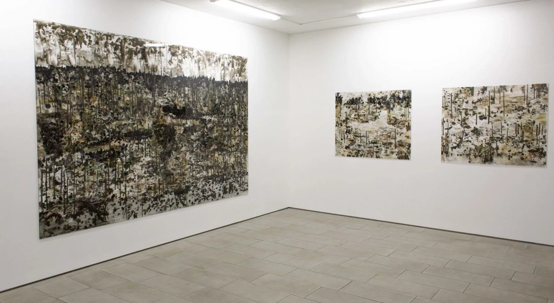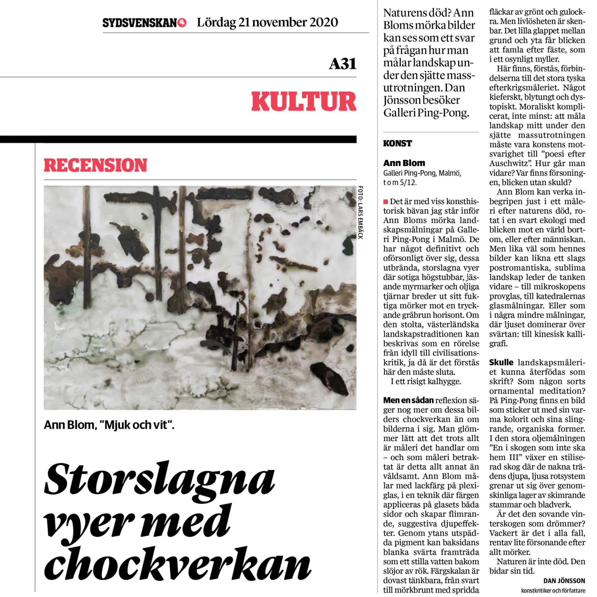 ”Det är en skog som förlåter allt men ingenting glömmer” skriver poeten Tomas Tranströmer i ”Molokai”. Medan fukten rasar över ytan i sotiga ridåer av moln föreställer jag mig de skikt som lagras i Ann Bloms topografi. Här ryms vildmarken och sluttningen bakom höghusen. Det som drömts, det som varit och det som väntar. Måleriets tyngd och lätthet. Någonstans moler en existentiell dimension. I bakgrunden lurar romantiken. Fast snarare än att bejaka dess besatthet av människans litenhet inför naturens och vädrets makter – ja, skapelsens storslagenhet – löser hon upp distansen. Där finns inga svindlande höjder, perspektiv eller utsiktspunkter. Bara dessa landskap att förlora sig i.