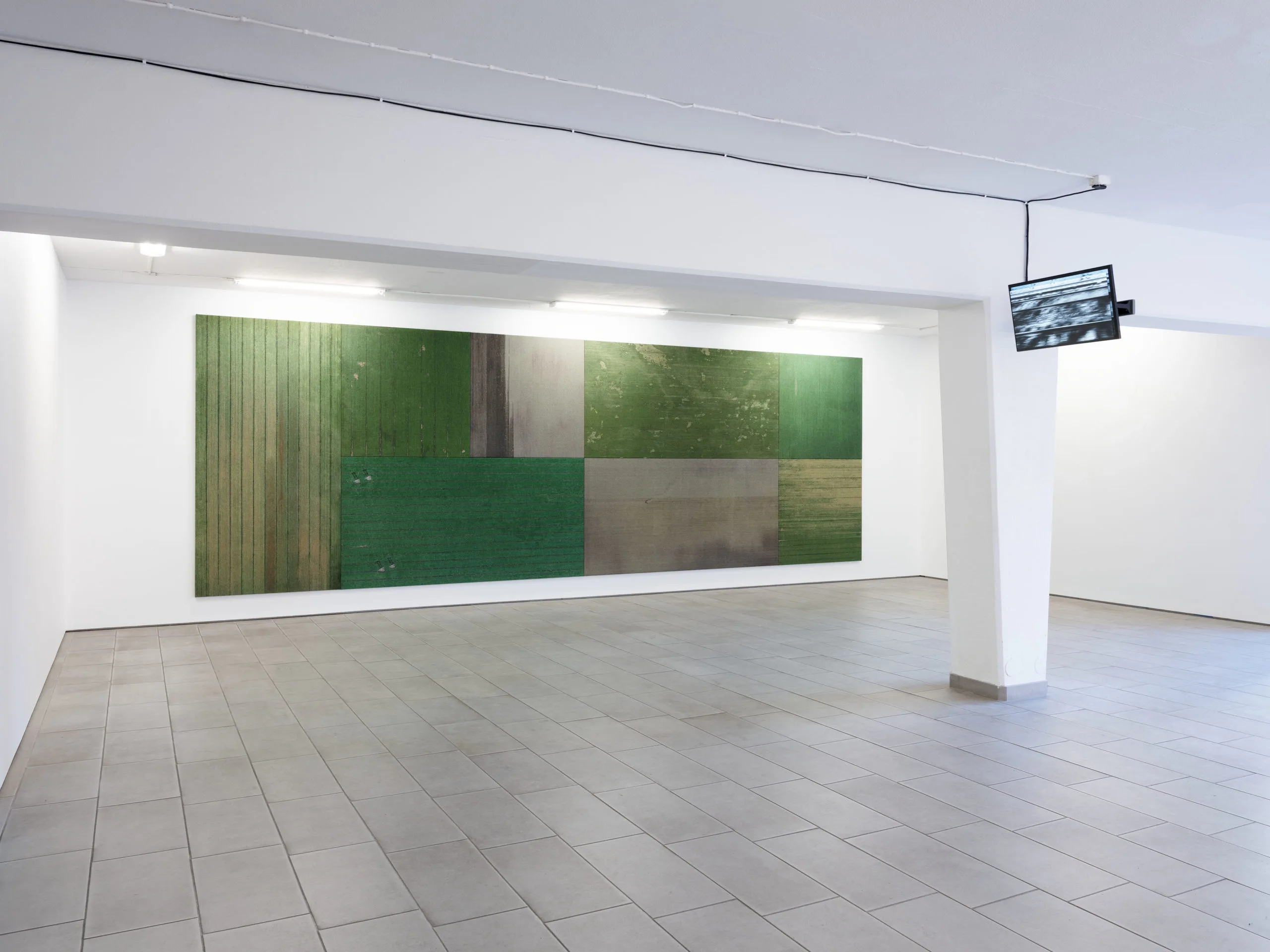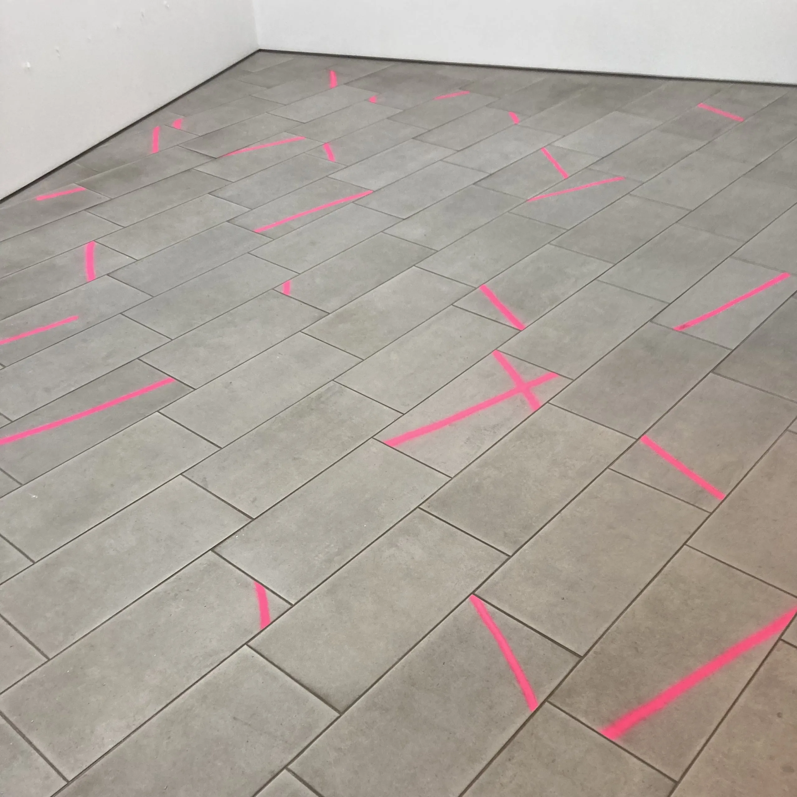 Positionslosigkeit, vad betyder ens den titeln, positionslöshet? Det måste vara det där i alla fall, platsen själv som Kristina Matousch upprättat åt oss. Spridda streck markeringsfärg på golvet, osammanhängande. En linje har hamnat i olag, i oordning. På en av plattorna korsar två linjer varandra. På fyra av plattorna går strecken inte från ena kanten till den andra, utan upphör en bit in. De måste utgöra ändpunkterna på linjerna. Det har nog bara varit ett kryss på marken, sedan har marken själv förändrats och flyttats om, golvplattorna. Och på väggen finns små bitar av maskeringstejp. De upprättar en ordning mellan sig, ett mönster som bildar ett svårläst, knappt synligt, ord: HELVETE. Det här är den mest avspända utställning jag har sett av Kristina Matousch. Förtvivlan verkar så lugn. I ett läge där kaos nu råder, så att linjerna som fortfarande korsar varandra också på sina håll går parallellt, känns tanken så väldigt balanserad och nykter: HELVETE. Vad annat kan det vara? Positionslöshet.